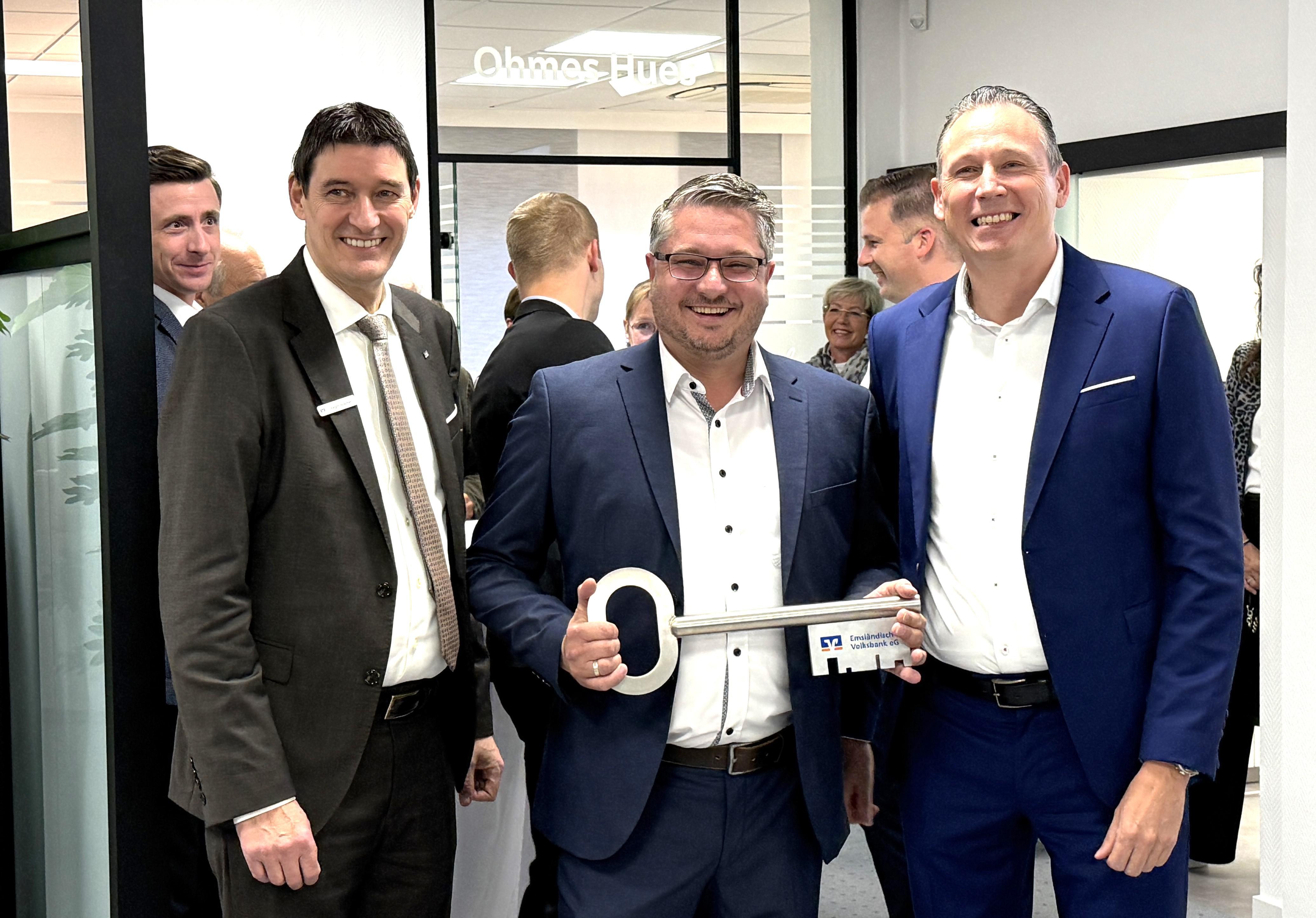 Filialleiter Michael Krüssel (Bildmitte) erhielt von den Vorständen Jürgen Hölscher (l.) und Carsten Schmees (r.) einen symbolischen Schlüssel für die renovierte Filiale der EVB in Wesuwe.